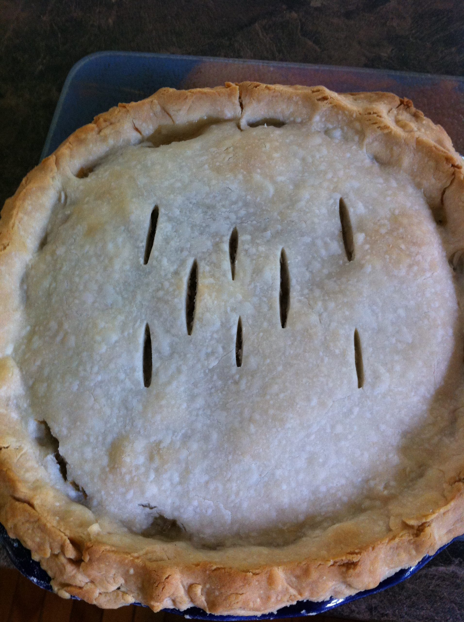 2. Preheat oven to 400 F, roll out crust. Spoon in pie filling, slashing the top crust to allow heat to escape, and bake for 45 minutes.